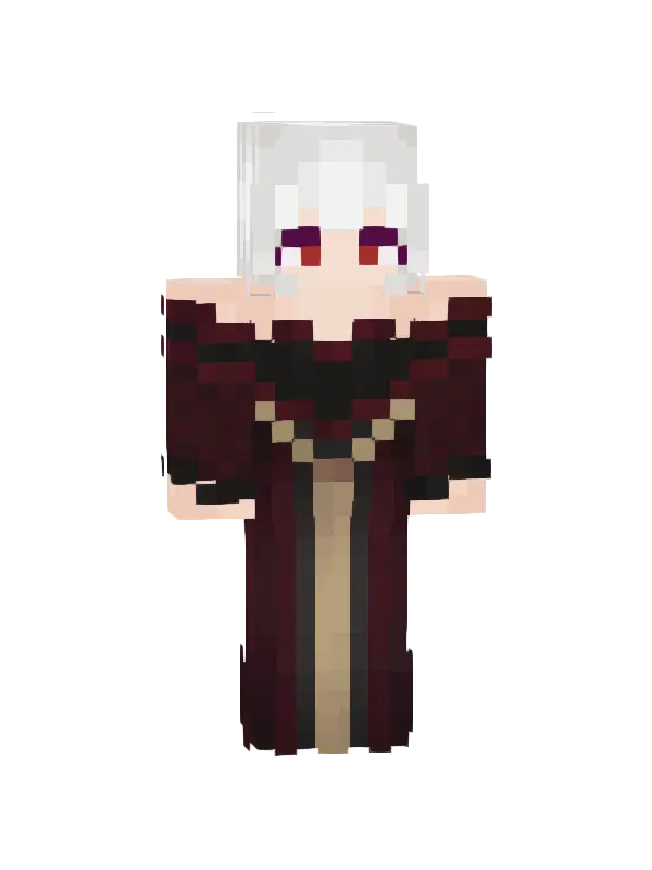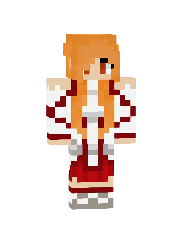 Skin wojowniczki Minecraft z długimi brązowymi włosami, białą szatą z czerwonymi detalami i ciemnymi spodniami, idealny do przygód!