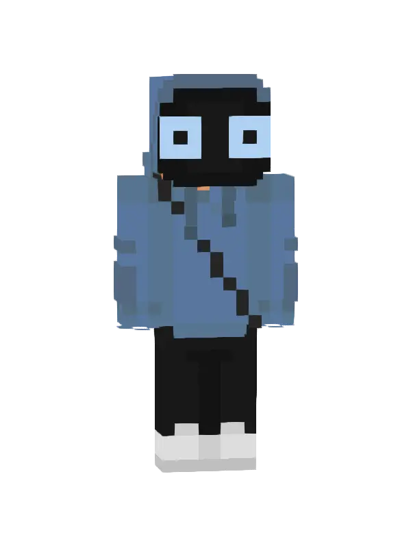Skin Minecraft stylowego gracza z brązowymi włosami i niebieskimi oczami, ubrany w czarny sweter oraz jeansy. Idealny do eksploracji świata Minecraft!