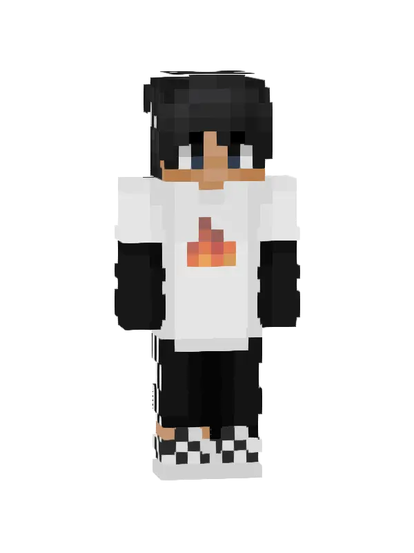 Skin Gracza Minecraft to stylowy wygląd z białym T-shirtem z ogniskiem, czarnymi rękawami oraz luźnymi spodniami i znanymi sneakersami. Idealny dla fanów!