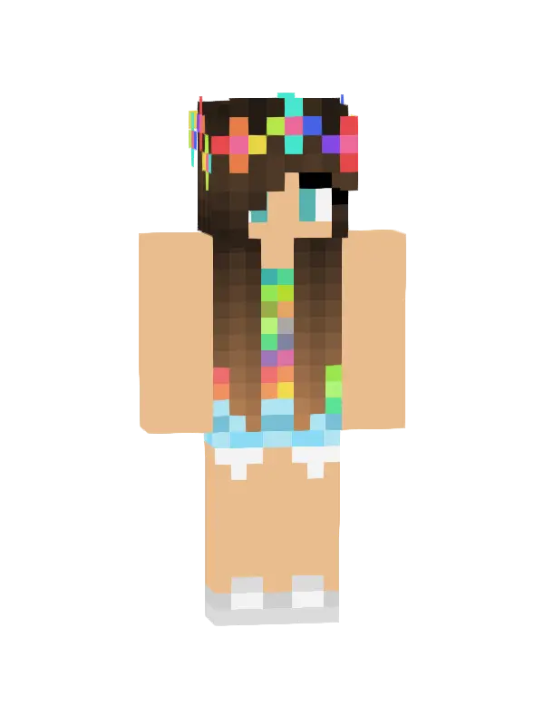 Skin tęczowej dziewczyny w Minecraft z długimi, czerwonymi włosami, kolorową bluzą i szortami. Idealny do wyrażenia swojej kreatywności!