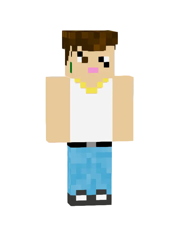 Skin Minecraft przedstawia stylowego gracza w różowej koszulce z motywem truskawki, z modnymi przetartymi dżinsami i białymi butami. Idealny look!