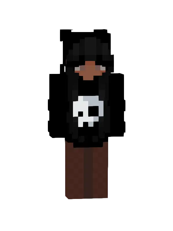 Skin Minecraft z tajemniczą postacią w czarnej bluzie z czaszką, krótkich spodniach i skarpetach w paski. Idealny dla fanów mrocznych klimatów!