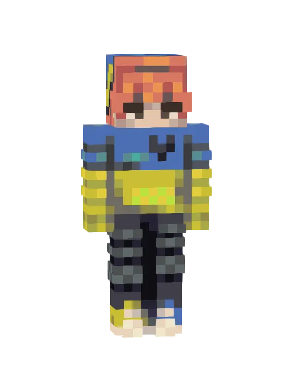 Skin Minecraft przedstawiający postać w jasnej bluzie, ciemnych spodniach i niebieskich akcentach na twarzy oraz rękach, idealny do wyróżnienia się w grze!