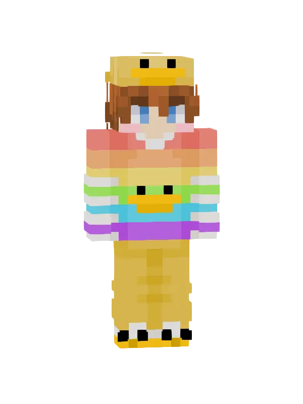 Skin Kolorowego Ptaszka w Minecraft to uroczy, tęczowy sweter z żółtym dziobem i pastelowymi włosami, idealny dla każdego miłośnika przygód!