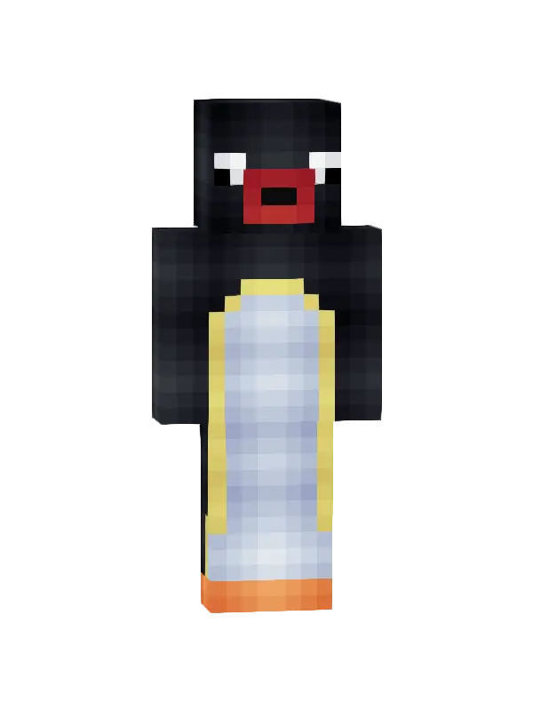 Skin Pingwina Minecraft przedstawia słodką postać w czarno-białym stroju z pomarańczowym noskiem i brązowym obuwiem, idealny do zabawy w grze!
