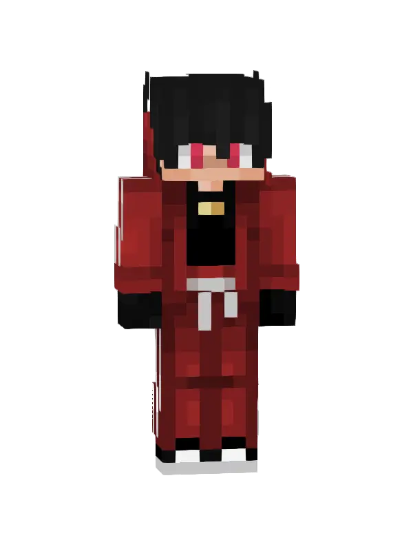 Skin shinobi Minecraft przedstawiający postać w szarym kimono z niebieskimi rękawami, czarnych spodniach i charakterystycznymi czerwonymi oczami. Idealny dla fanów ninja!