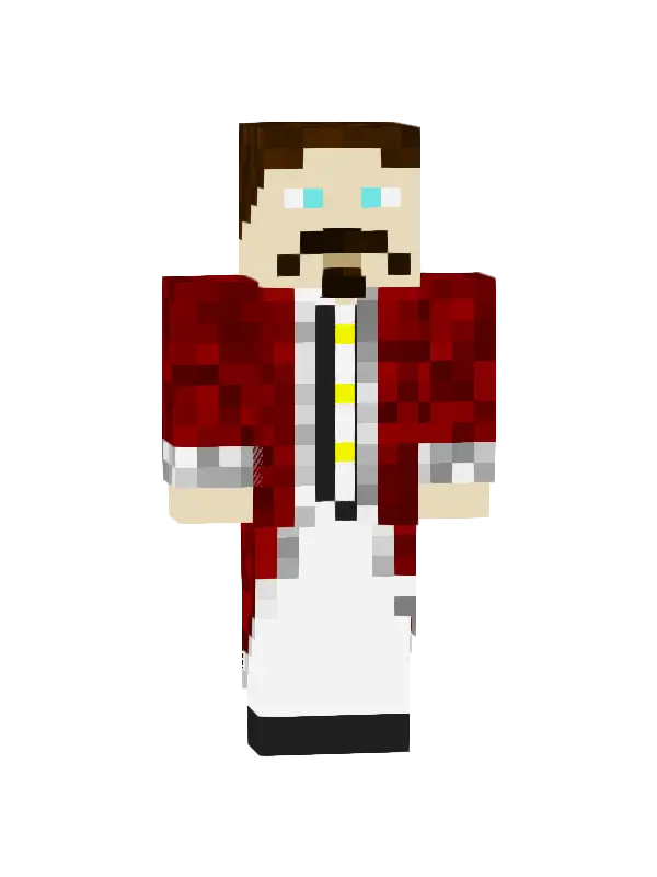 Skin eleganckiego mężczyzny w Minecraft z różowym ciałem, niebieską koszulą, czarną kamizelką i czerwonym krawatem. Idealny do wyróżnienia się w grze!