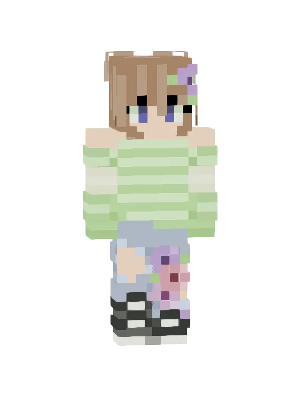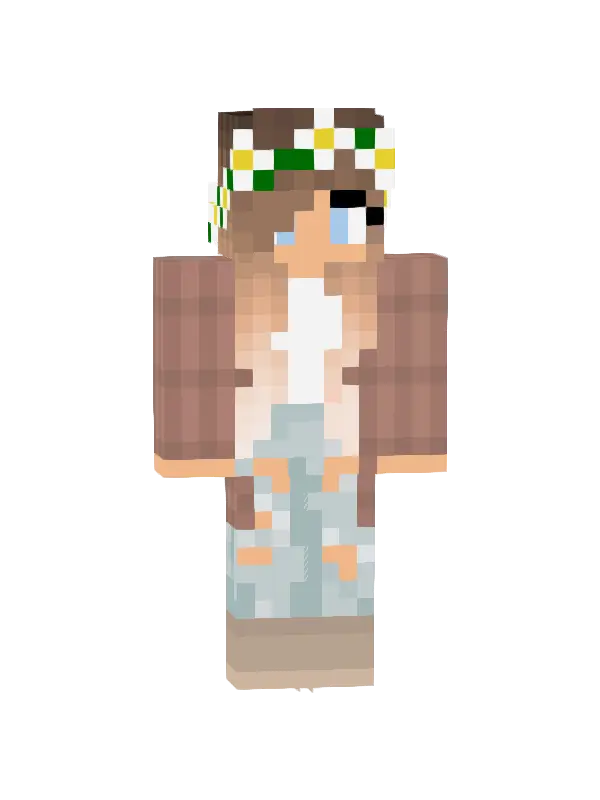 Skin Kobiety w Minecraft, uroczy styl z kwiatową opaską, pomarańczowym topem i niebieskimi spodniami. Idealny dla miłośniczek unikalnych strojów!