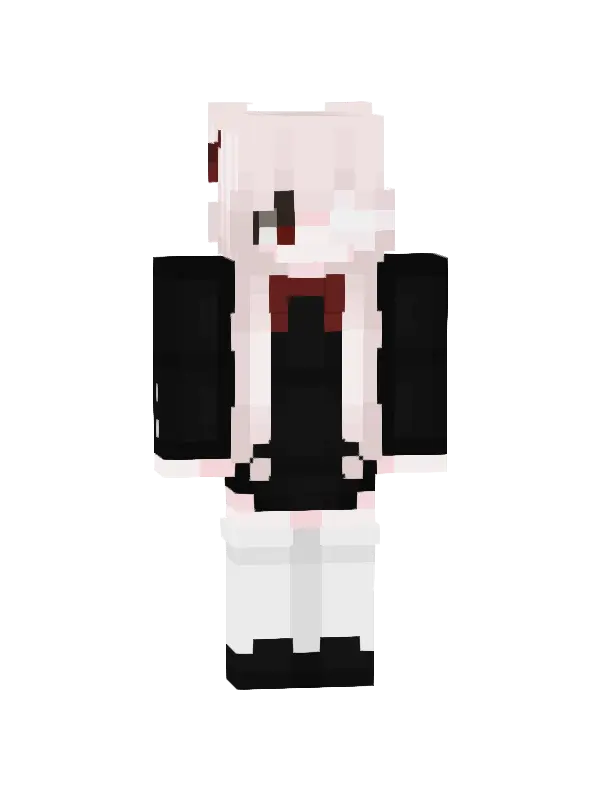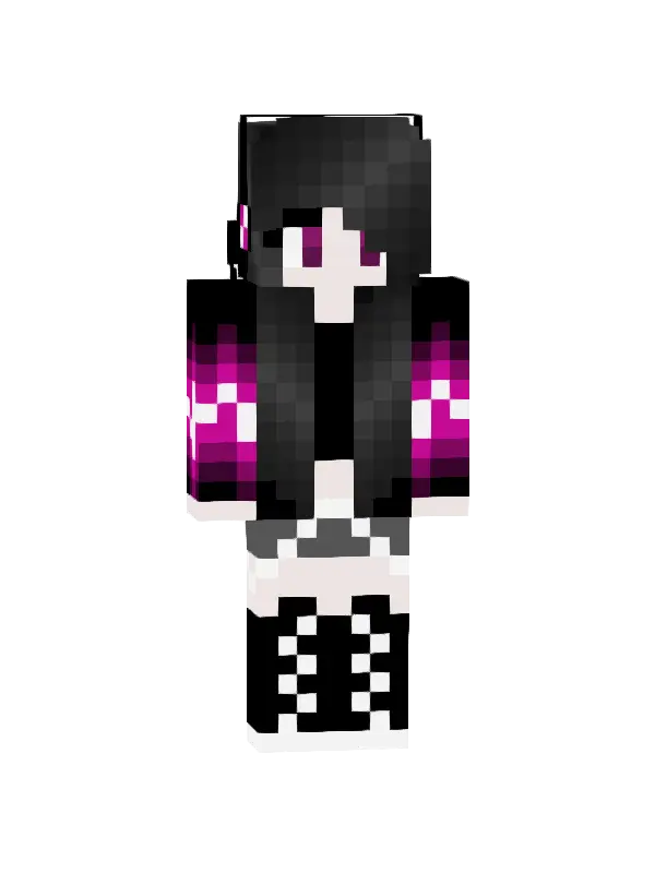 Skin dziewczyny w Minecraft z długimi czarnymi włosami i czerwonymi akcentami. Ubrana w czarną sukienkę i białe skarpetki, idealna do wyróżnienia się!
