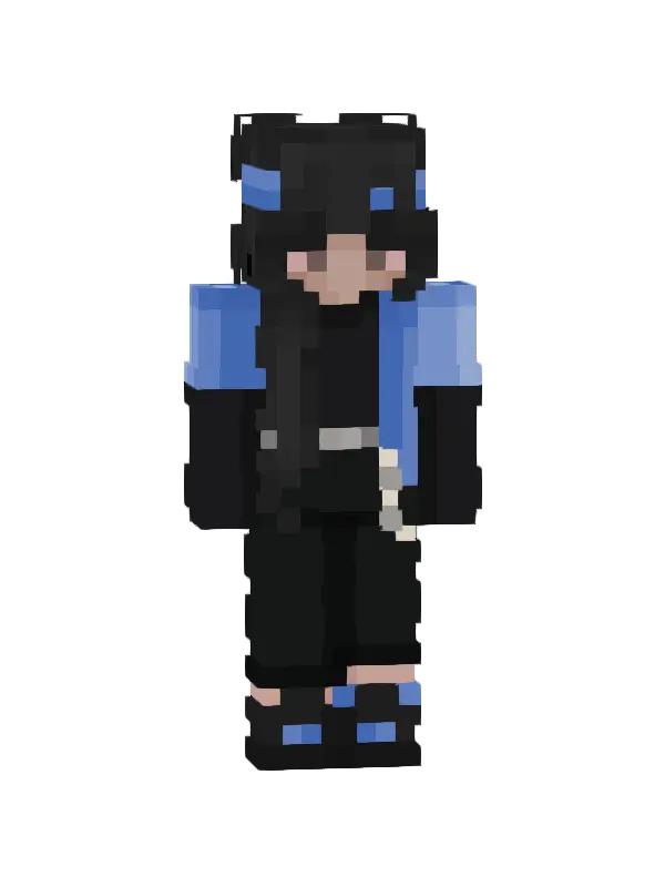 Skin Minecraft o imieniu "Nieformalny Odkrywca" charakteryzuje się granatowym kombinezonem, niebieskimi akcentami i czarnymi włosami, idealny dla poszukiwaczy przygód!