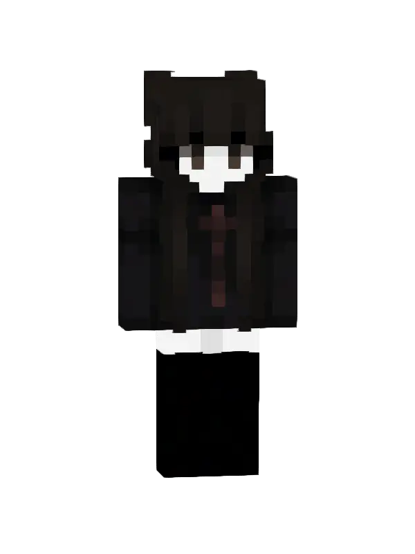 Skin Szkieletora Minecraft prezentuje postać z połową twarzy w stylu czaszki, w czarnej bluzie, białych spodniach i sportowych butach. Idealny dla fanów mrocznych klimatów!