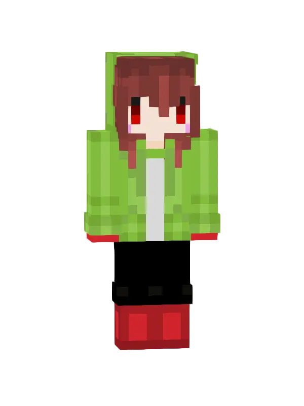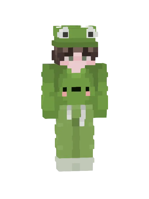 Skin żaby w Minecraft to uroczy strój z zieloną bluzą z kapturem, krótkimi spodenki i sportowymi butami, idealny do zabawy w grze!