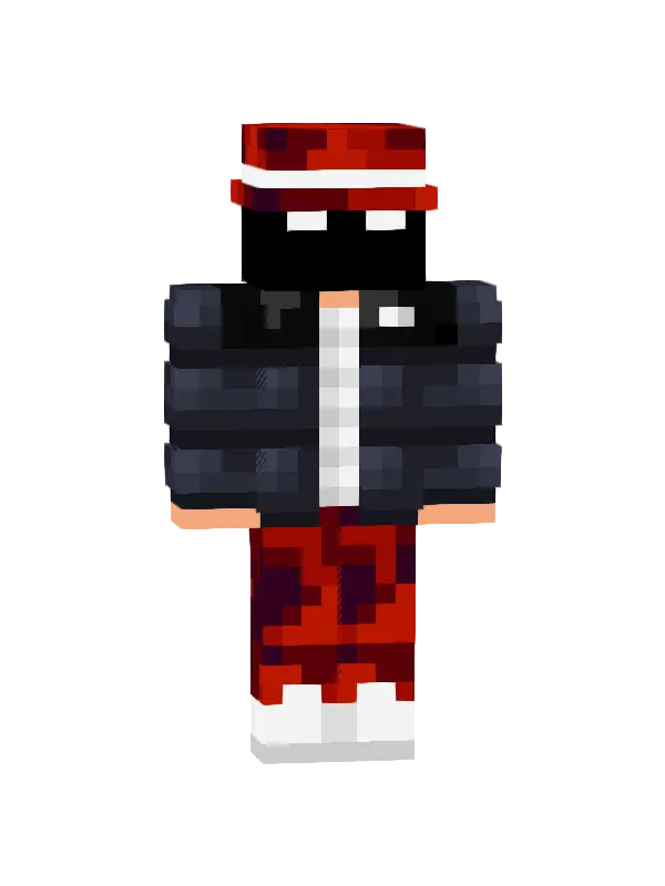 Skin Cool Chłopaka Minecraft to stylowy skórzany płaszcz w czerwonym kolorze, niebieska koszula, dżinsy i okulary przeciwsłoneczne. Wyróżnij się w grze!