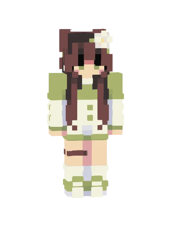 Skin modnej dziewczyny w Minecraft z długimi brązowymi włosami, białą bluzą i zielonymi ogrodniczkami. Idealny wybór dla stylowych graczy!