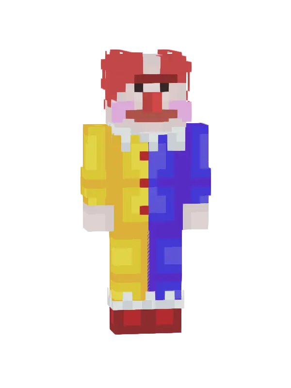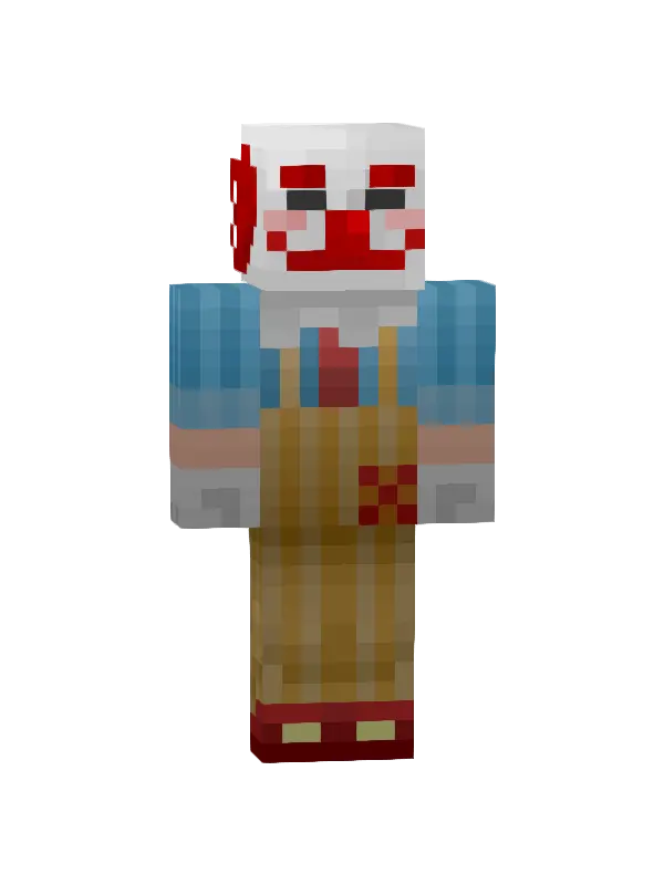 Skin Klauna Minecraft charakteryzuje się zabawną maską z uśmiechem, zieloną bluzą z białymi paskami oraz czarnymi spodniami, idealny do wyróżnienia się w grze!