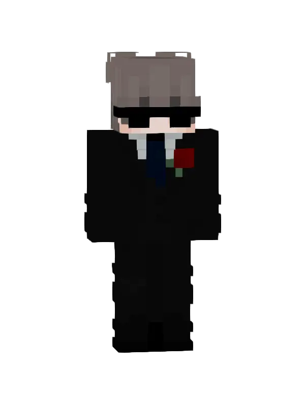 Skin Eleganckiego Mężczyzny Minecraft nosi czarny garnitur z białą koszulą i czerwoną muszką, a dopełnia go kapelusz i okulary przeciwsłoneczne, idealny dla stylowych graczy!