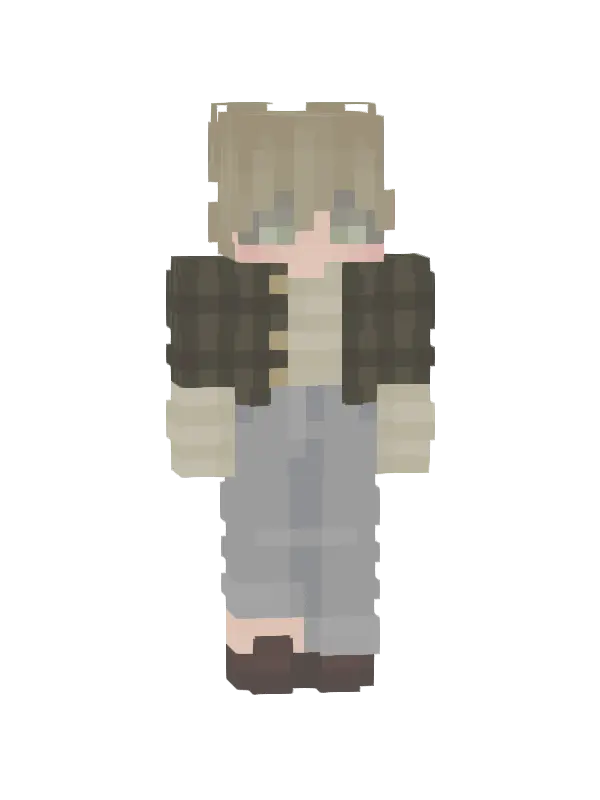 Skin stylowej postaci Minecraft z jasnymi włosami i niebieskimi oczami. Ubrany w ciemną bluzę oraz jasne spodnie, idealny dla modnych graczy!