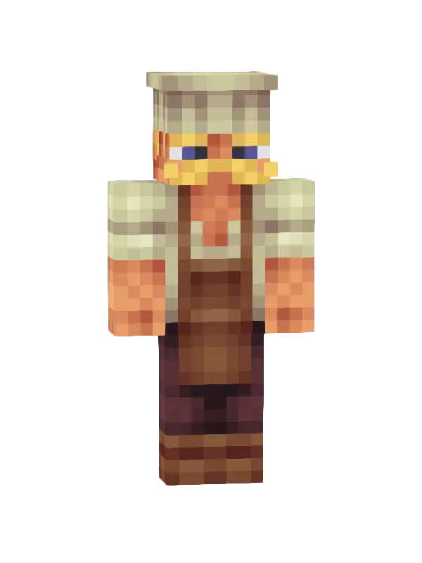 Skin Staruszka w Minecraft, z brązowym kapeluszem i niebieskimi ogrodniczkami. Idealny do zabawy i wyróżnienia w wirtualnym świecie!