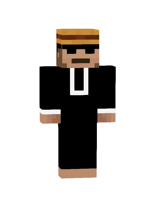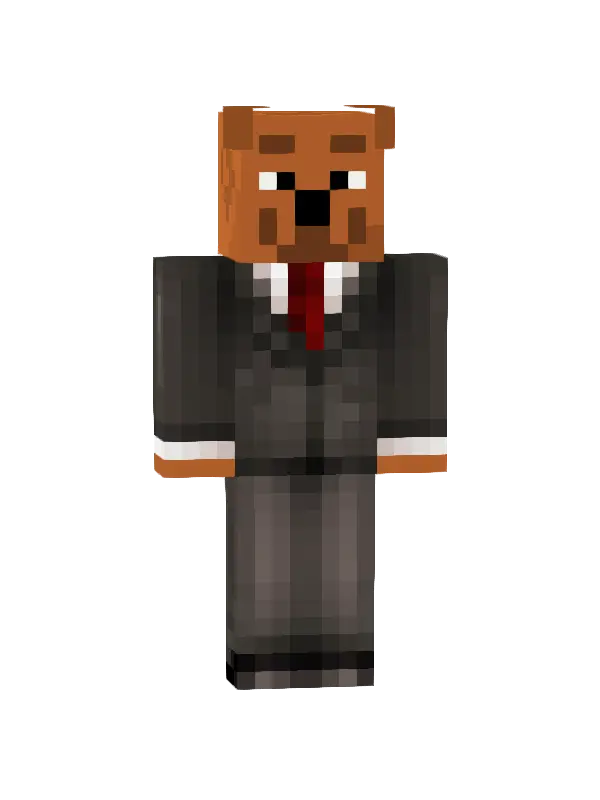 Skin Minecraft z niebieską głową z uśmiechem i żółtą koroną. Ubrany w elegancki brązowy garnitur, idealny do wyróżnienia się w grze!