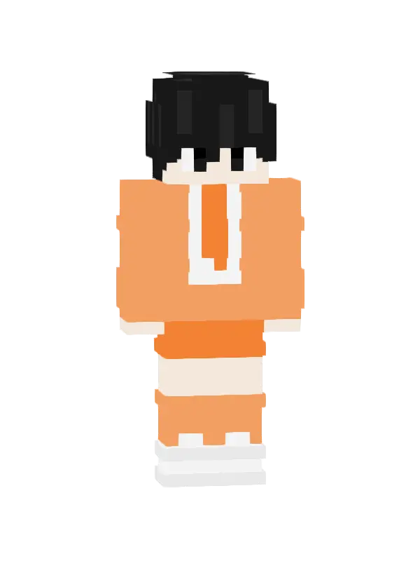 Skin Minecrafta w stylu więziennym, z brązowymi i czarnymi paskami oraz białym kapturkiem. Idealny wybór dla fanów przygód w Minecraft!