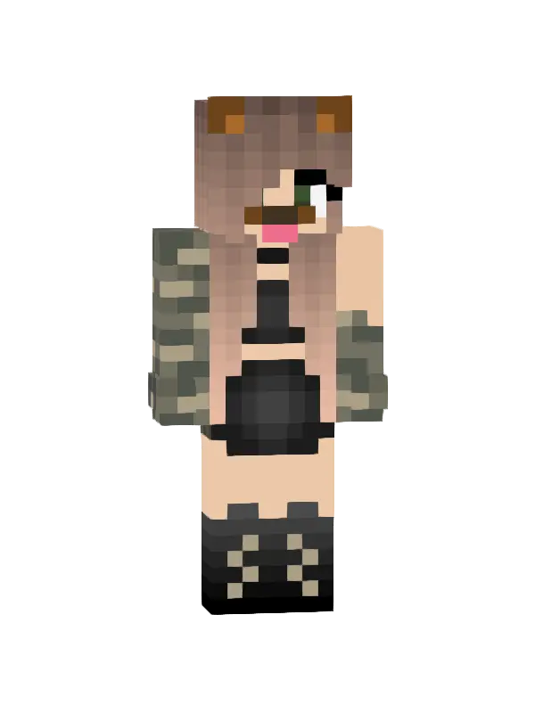 Skin wojowniczki Minecraft z długimi, różowymi włosami oraz zielonymi i beżowymi ubraniami w kamuflaż. Idealny dla fanów unikalnych stylów!