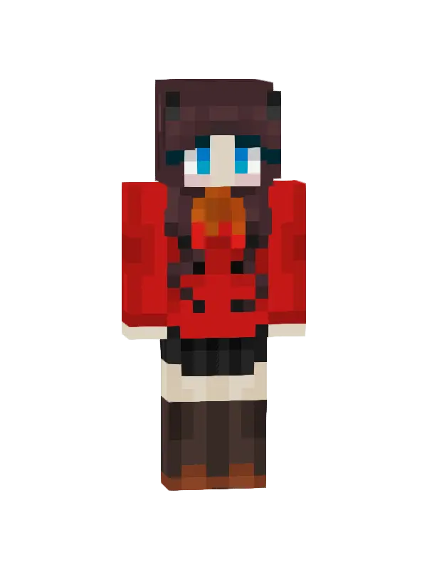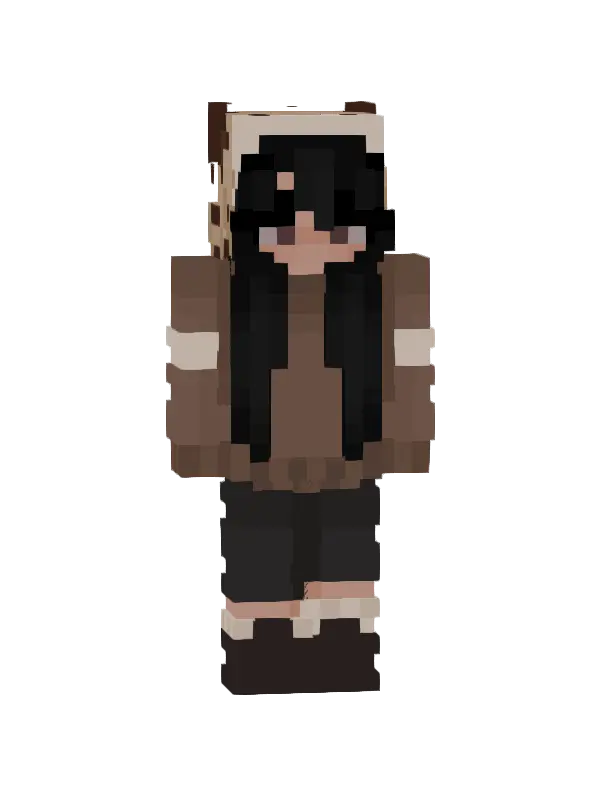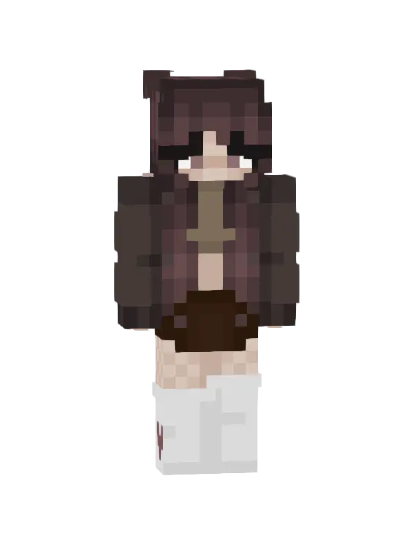 Skin do Minecraft w stylu kawaii, przedstawiający postać z długimi brązowymi włosami, szaro-zieloną bluzą i białymi skarpetami. Idealny dla fanów słodkich stylizacji!