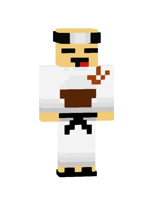 Skin Minecraft w stylu eleganckiego kucharza, z białym fartuchiem, czerwoną koszulą i złotym paskiem. Idealny dla miłośników gotowania w grze!