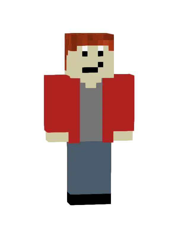 Skin Minecraft przedstawiający postać w niebieskiej koszulce, czerwonym kamizelce i czarnych rękawach. Idealny dla fanów stylu retro w grze!