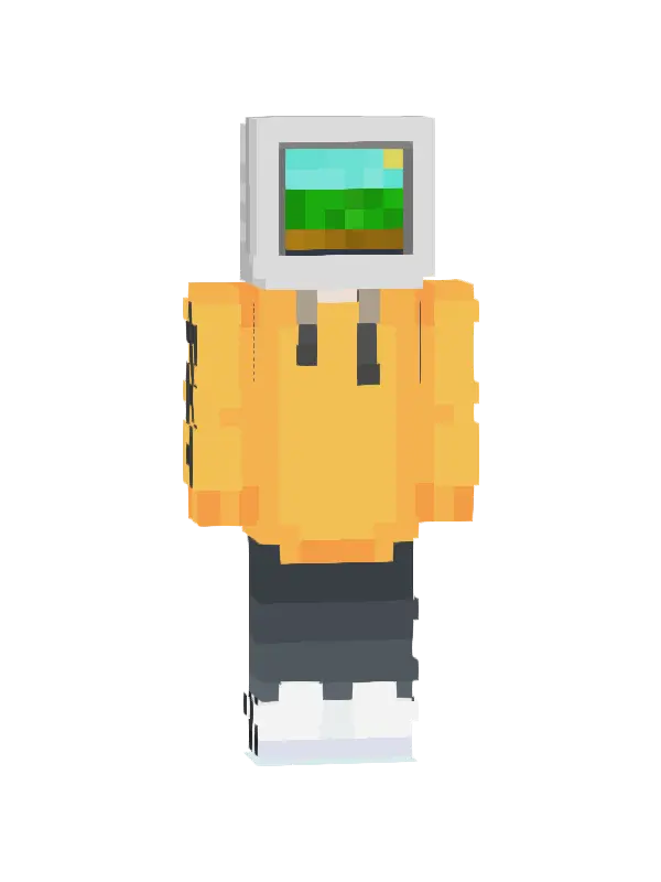 Skin Telewizora Minecraft, z charakterystyczną głową w kształcie telewizora, czarnym strojem i kolorowymi rękawami. Idealny dla fanów nowoczesnych stylów!