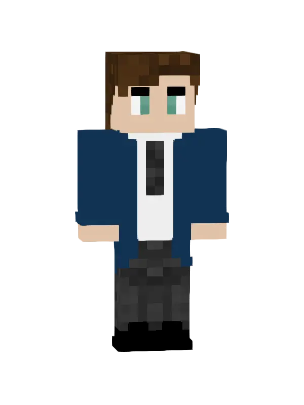 Skin Minecraft przedstawiający postać w eleganckim, brązowym garniturze, białej koszuli i niebieskim krawacie. Idealny do wyróżnienia się w grze!