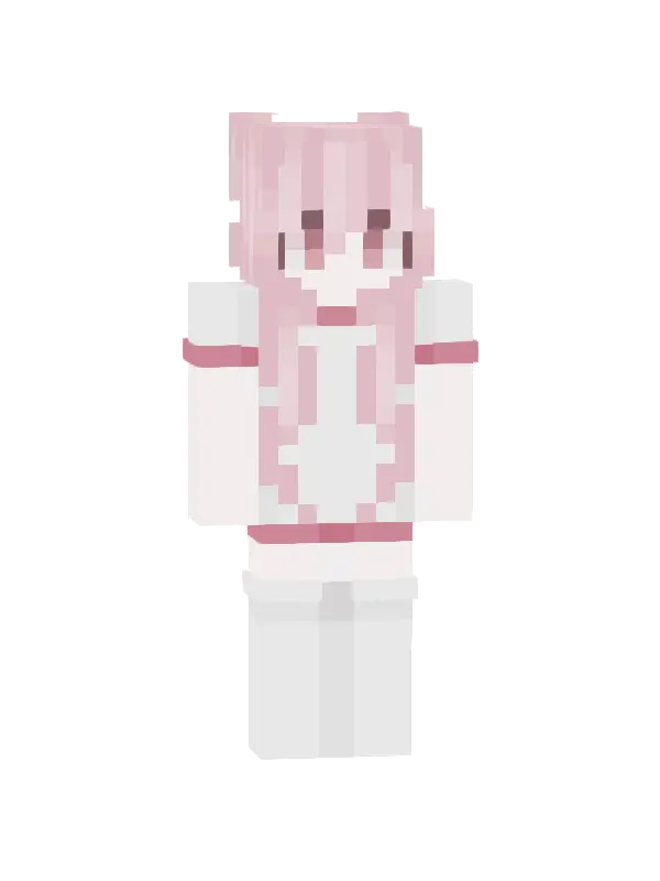 Skin różowej postaci w Minecraft z długimi, blond włosami, w białej bluzie i stylowych spódnicach. Idealny wybór dla fanów kawaii estetyki!
