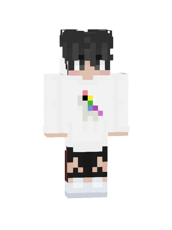 Skin Unikorna Minecraft to modny, czarny sweter z kolorowym rysunkiem jednorożca, jasne spodnie i białe buty, idealny dla kreatywnych graczy!