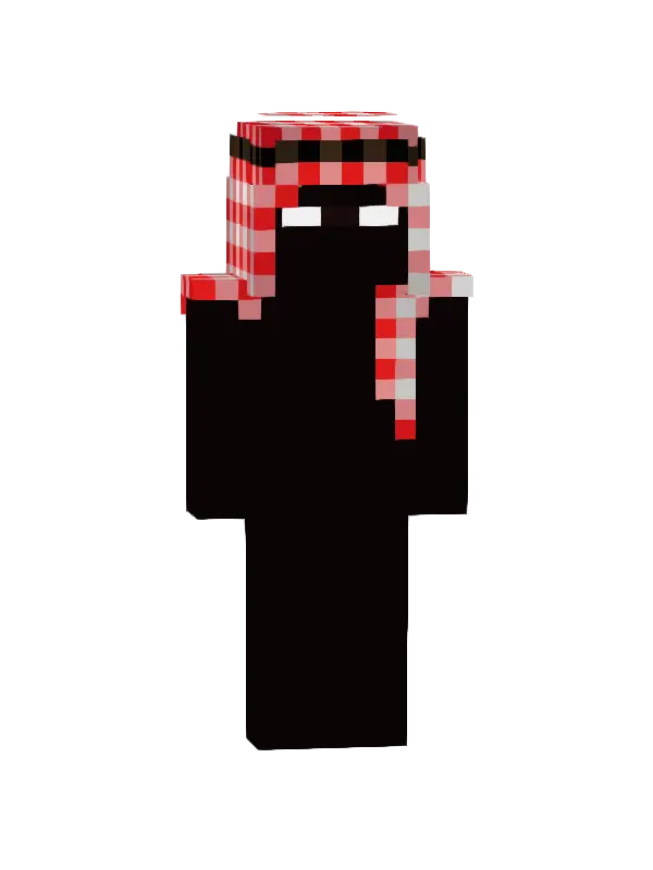 Skin Minecrafta inspirowany popularnym motywem, z czarnym ubraniem i czerwonym akcentem w kształcie logo. Doskonały wybór dla fanów unikalnych stylizacji!