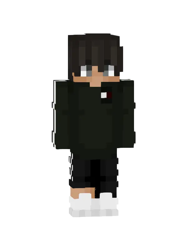Skin hipstera w Minecraft, z ciemnymi spodniami, zielonym swetrem z logo oraz modnymi białymi butami. Idealny dla miłośników stylu street!