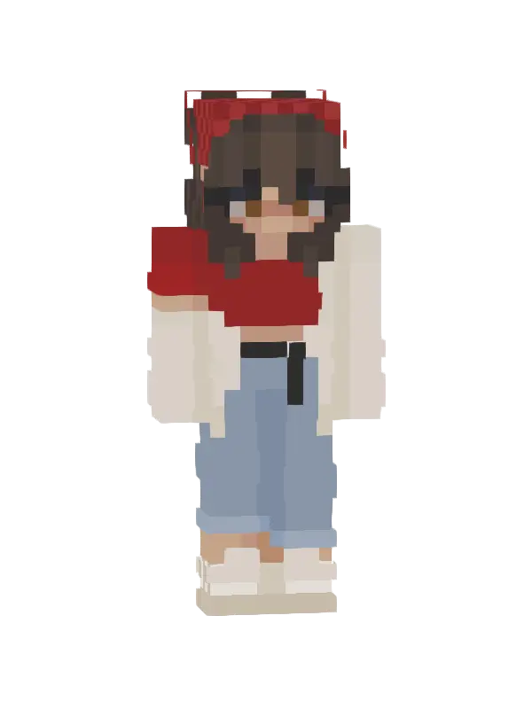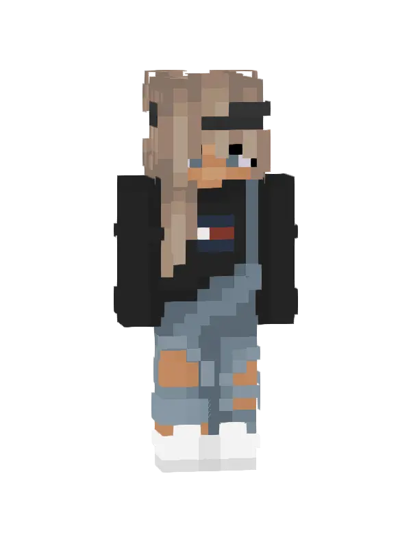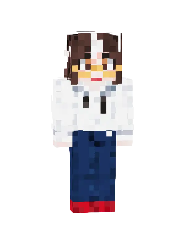 Skin Minecraft przedstawiający postać w fioletowej bluzie z kapturem, podartymi dżinsami i białymi butami. Idealny dla miłośników stylu casual!